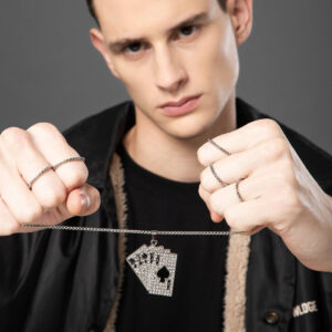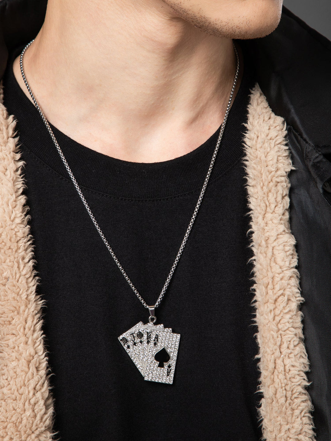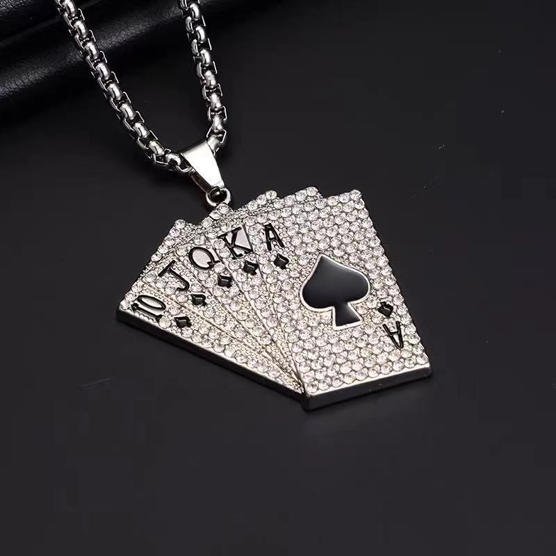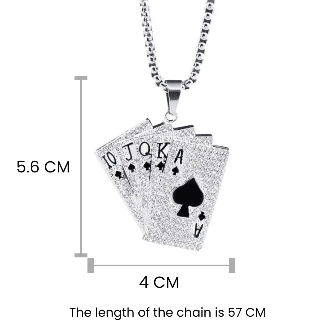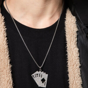 • Iced-Out Pendant – Poker playing cards (10, J, Q, K, A) encrusted with shimmering stones